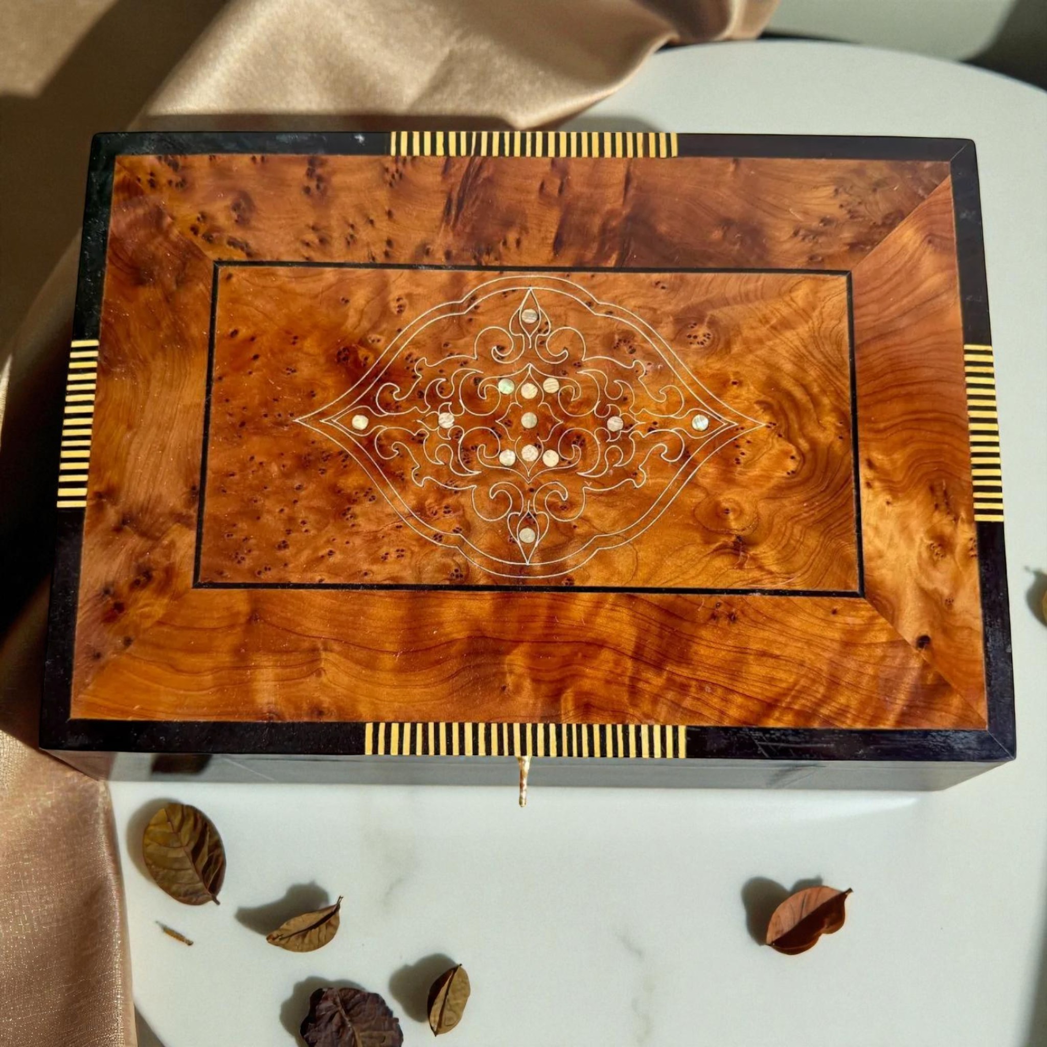 Carved from rare Thuya root burl found in Morocco’s Atlas Mountains, each Lockable Jewelry Box features: